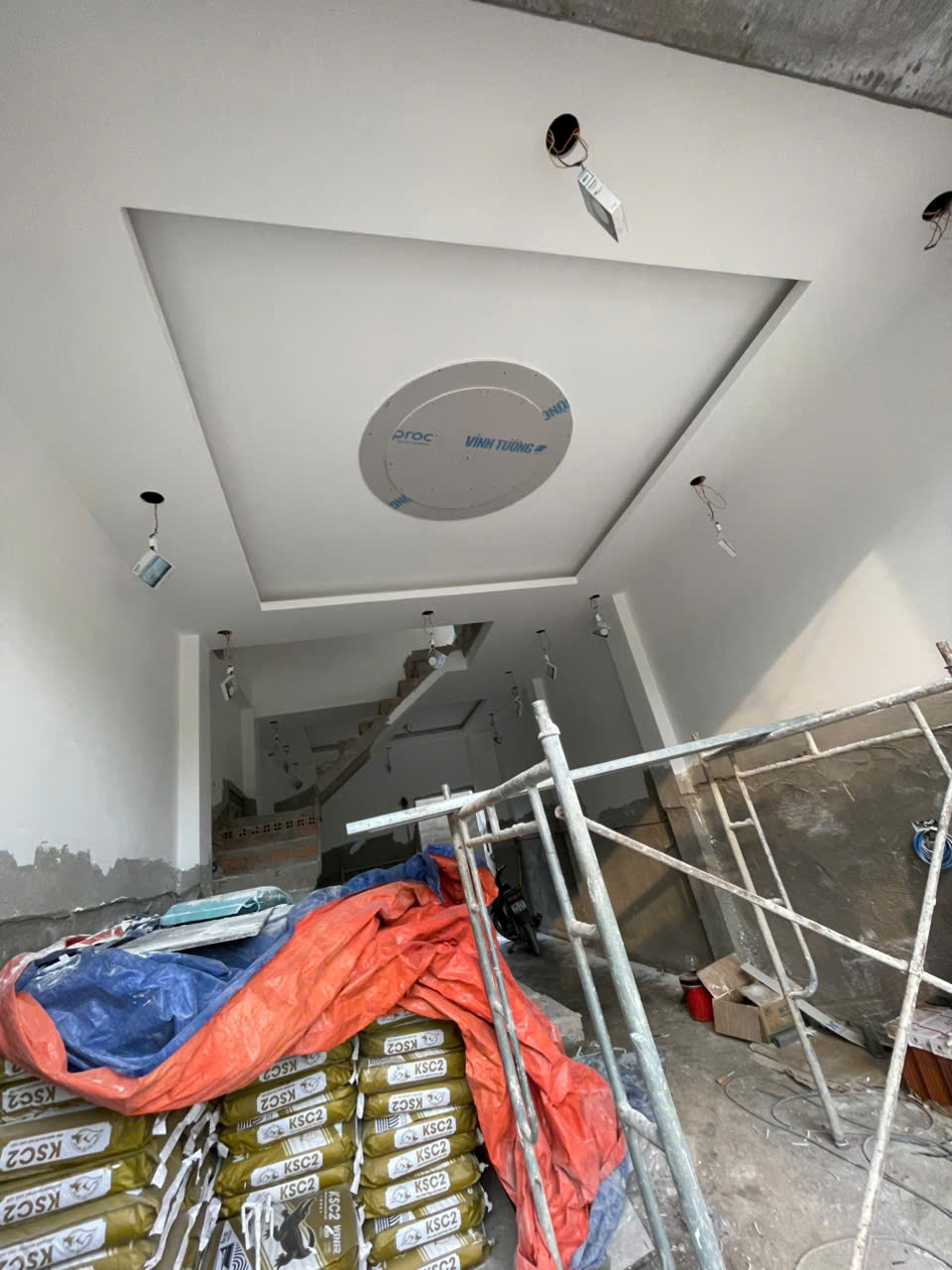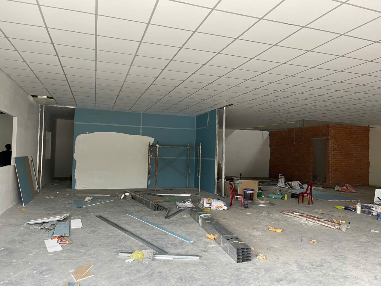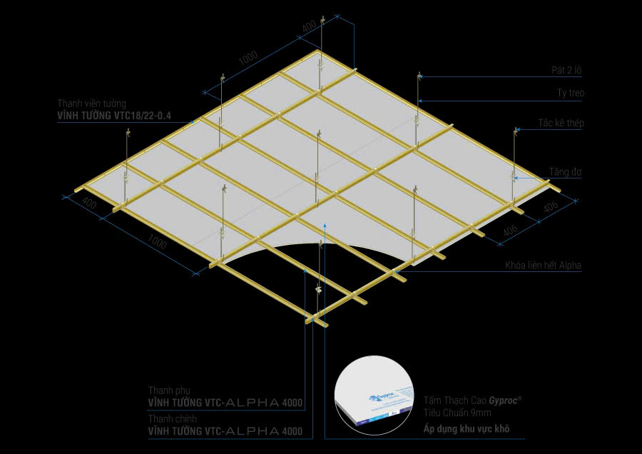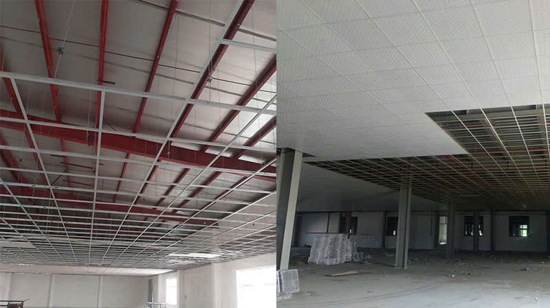 • Khung xương lộ ra bên dưới, tấm thạch cao đặt lên trên khung.