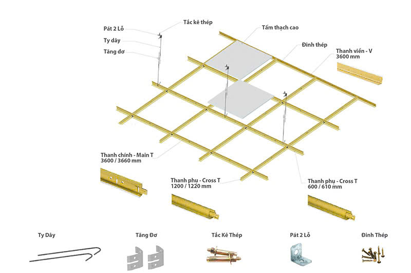 Trần thạch cao là hệ trần treo bên dưới trần bê tông, được cấu tạo từ: